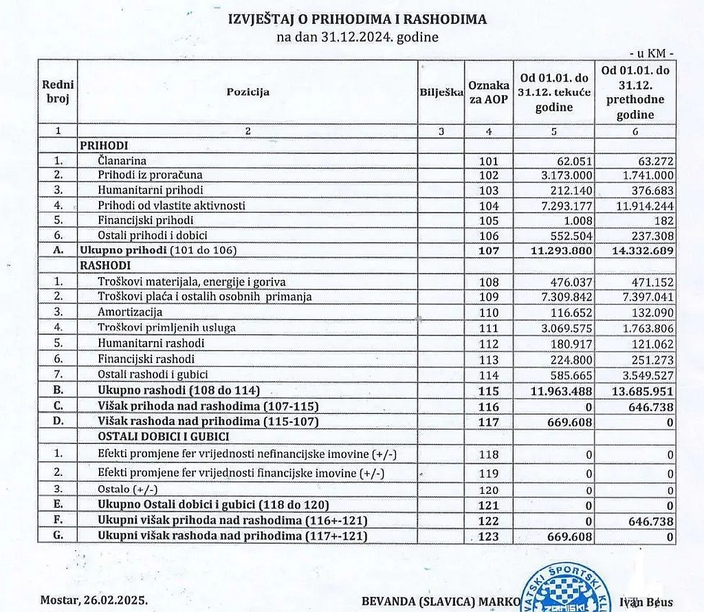 Mostarski klub je poslovao u minusu od 669.608 KM, s obzirom da je u prošloj godini ostvario prihode od 11.293.880, dok su rashodi bili 11.963.488 KM.