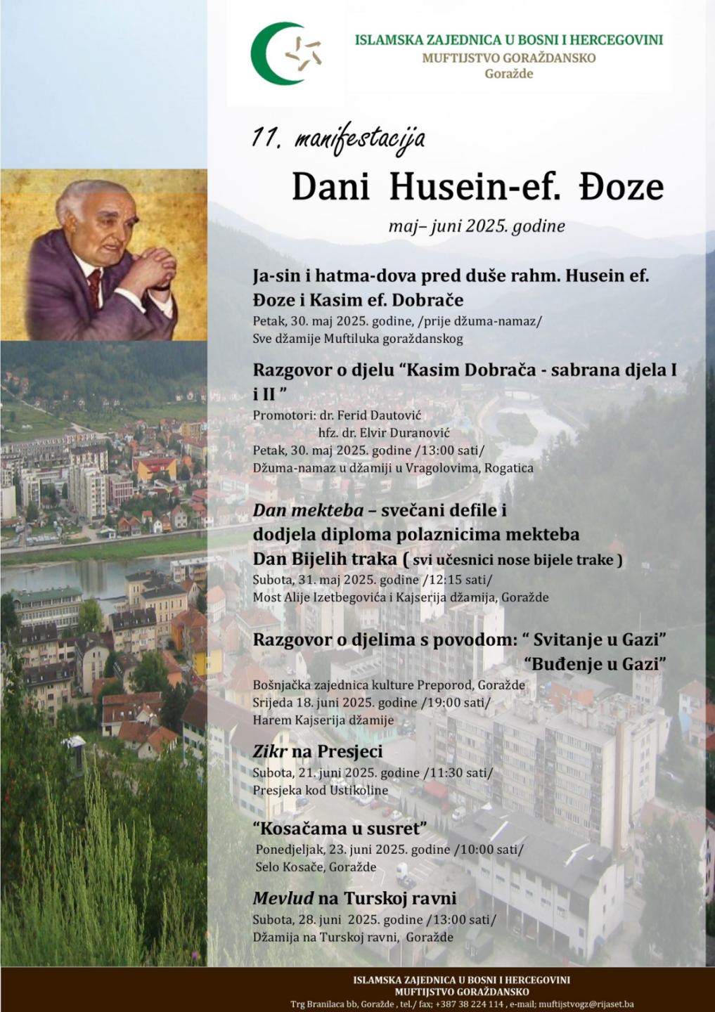 Tradicionalna 11. manifestacija "Dani Husein-ef. Đoze" bit će održana od 30. maja do 28. juna, uz brojne programe koje će Muftijstvo goraždansko realizirati u saradnji s medžlisima i drugim partnerima ove manifestacije.