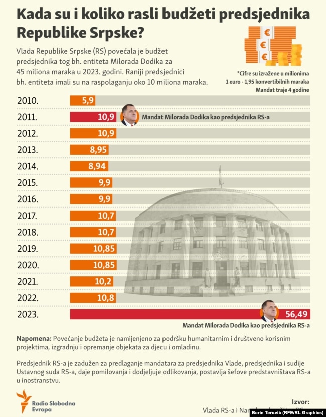 Budžet predsjednika Republike Srpskea je duže od decenije iznosio oko pet miliona eura, da bi doživio pravu "eksploziju" kada se Dodik vratio na ovu funkciju krajem 2022. godine.