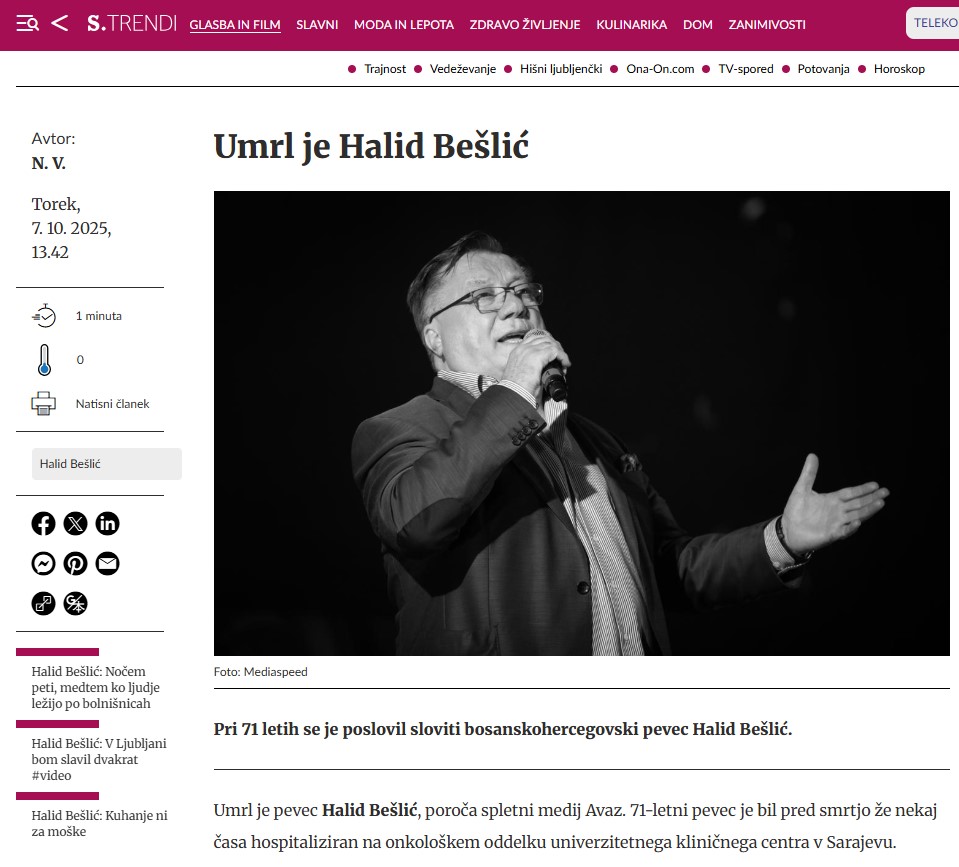 "Prije samo nekoliko sedmica predstavio je pjesmu posvećenu supruzi Sejdi, s kojom je bio u braku od 1977. godine i koju je često spominjao kao svoju glavnu podršku u karijeri", stoji u tekstu tekstu Siol portala.