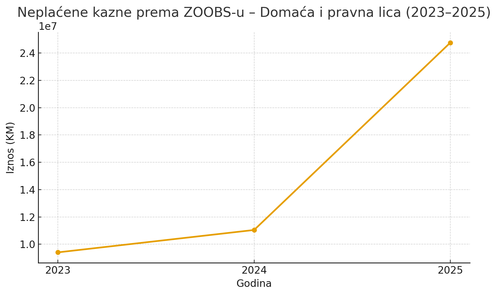 U odnosu na 2024. godinu, iznos neplaćenih kazni u 2025. godini više je nego udvostručen (porast od 124,2%), što jasno ukazuje na potrebu jačeg mehanizma naplate i dosljednije kontrole izvršenja kazni.