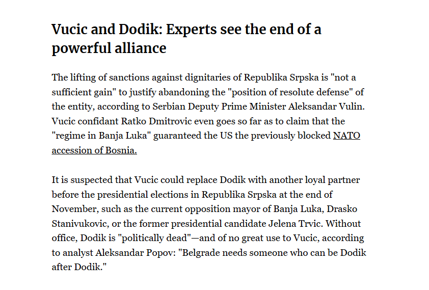 "Sumnja se da bi Vučić mogao zamijeniti Dodika drugim lojalnim partnerom prije predsjedničkih izbora u Republici Srpskoj krajem novembra, kao što je trenutni opozicioni gradonačelnik Banje Luke, Draško Stanivuković, ili bivša predsjednička kandidatkinja Jelena Trivić. Bez funkcije, Dodik je „politički mrtav“ — i nije od velike koristi Vučiću, prema analitičaru Aleksandru Popovu: „Beogradu treba neko ko može biti Dodik nakon Dodika.“