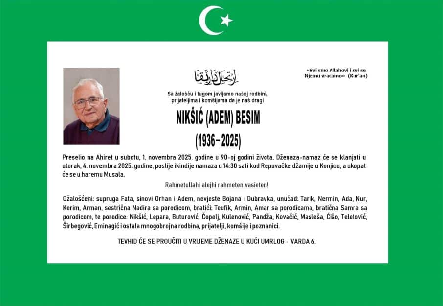 Dženaza Besimu Nikšiću će se klanjati u utorak, 4. novembra 2025. godine, poslije ikindije-namaza u 14:30 sati kod Repovačke džamije u Konjicu, a ukopat će se u haremu Musala. Tevhid će se proučiti u vrijeme dženaze, u kući umrlog, na adresi Varda 6, izvijestio je Radio Konjic.
