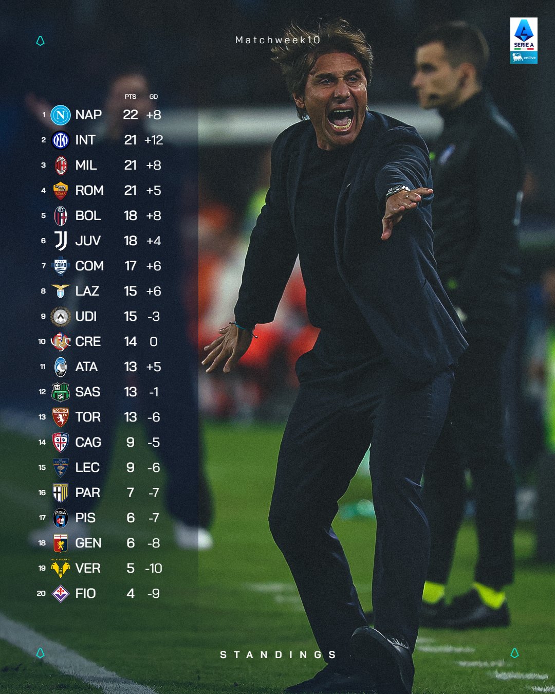 Na vrhu je Napoli s 22 boda, a zatim slijede Inter, Milan i Roma s po 21 bodom.