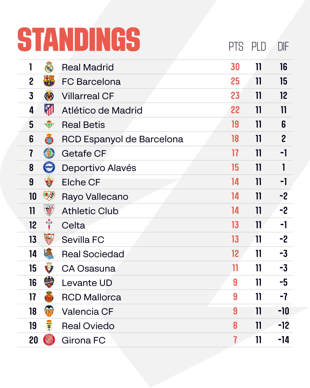 Na vrhu tabele je Real Madrid s 30 bodova, Barcelona ima 25, a Villarreal 23 boda.