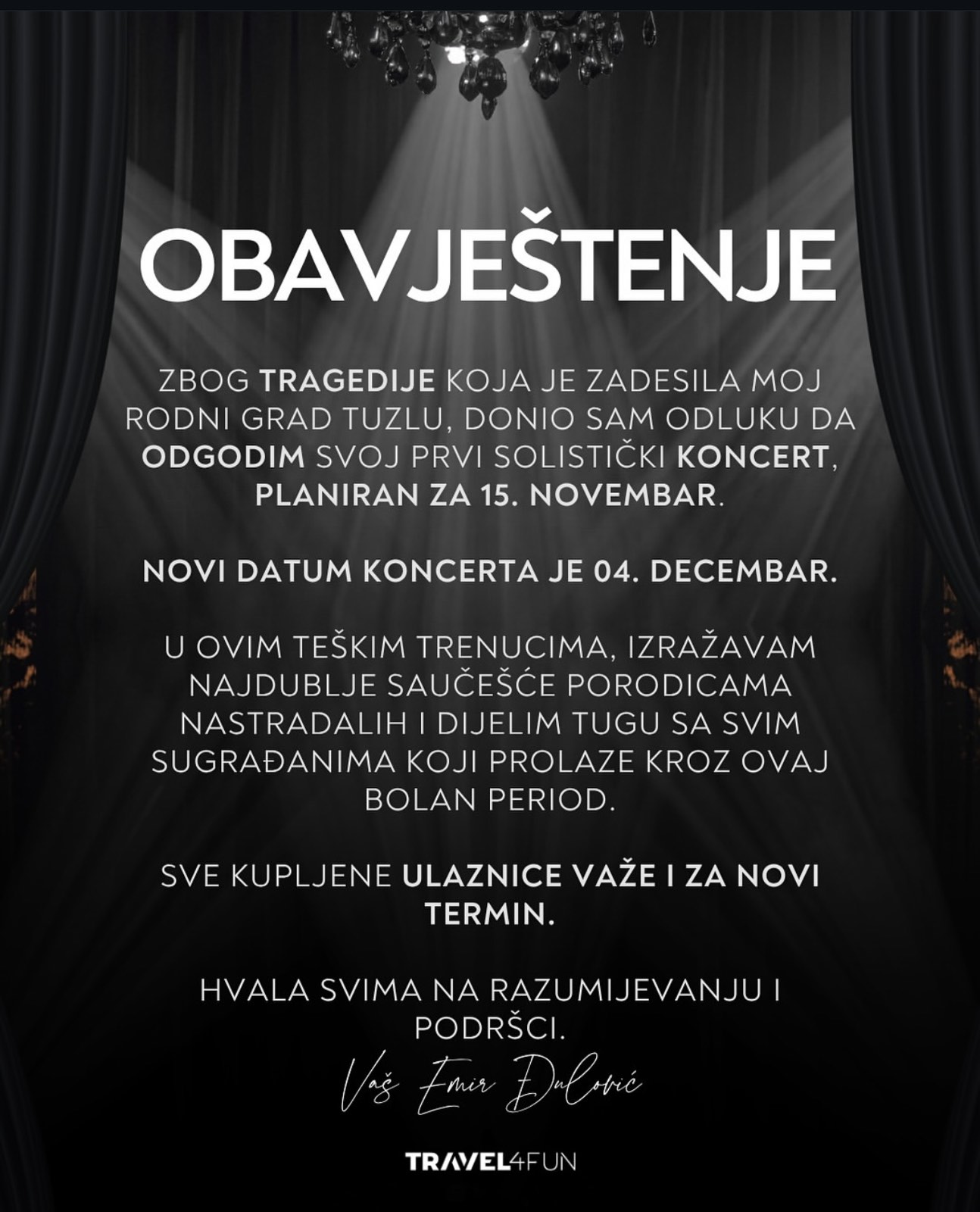 "Zbog tragedije koja je zadesila moj rodni grad Tuzlu donio sam odluku sa svojim timom da odgodim svoj prvi solistički koncert planiran za 15.11. Novi datum koncerta je 4.12.2025.