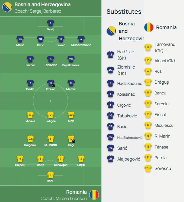 Prethodno je, u 14. minuti, sam pred Vasiljem bio i Mihaila kojeg je dugom loptom uposlio Dennis Man, ali je napadač Rumunije sa oko 13 metara šutirao pored istračalog Vasilja, ali i pored lijeve stative.