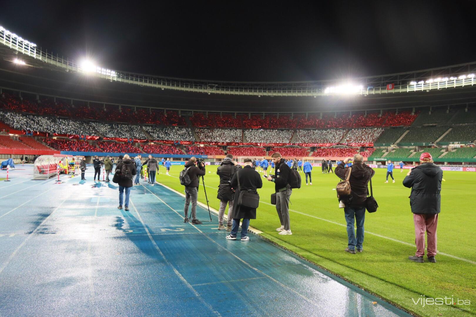 Po dolasku na stadion naše reprezentativce je zatekla lijepa koreografija. Na tribini iza gola, austrijski navijači su postavili koreografiju u obliku njihove zastave.