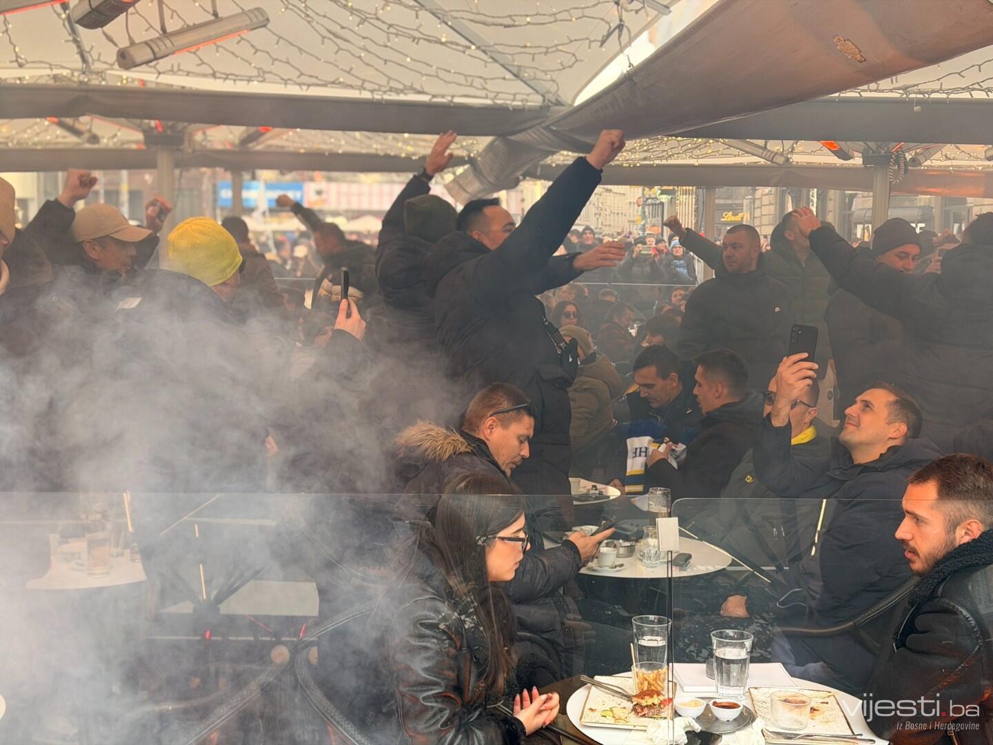 Pjevaju se naše pjesme, od himne do sevdalinki, atmosfera je razigrana, emotivna bosanska.