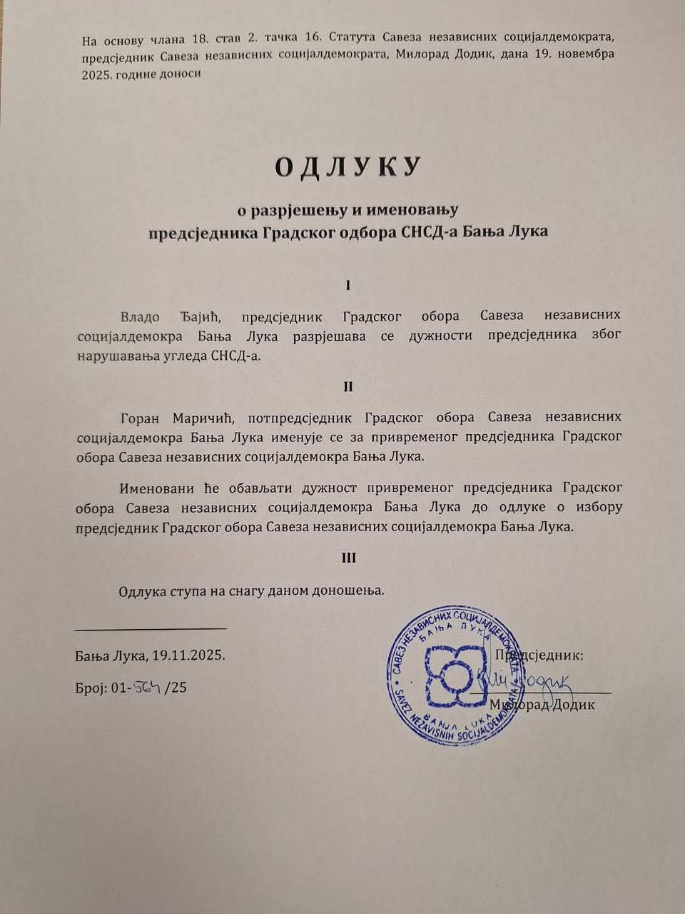 Prema njegovim riječima, SNSD neće tolerisati bilo kakve dodire sa kriminalnim aktivnostima, a posebno ne s narkoticima, te je istakao da je Đajić ovim potezom “sam sebe uklonio sa svih funkcija”.