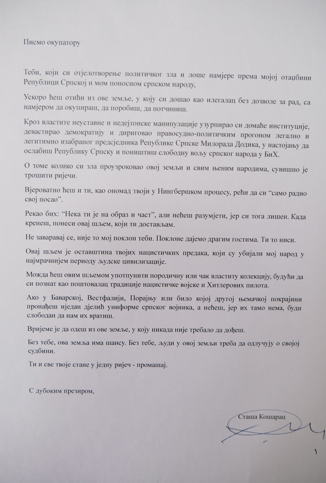 Tebi, koji si otjelotvorenje političkog zla i loše namjere prema mojoj otadžbini Republici Srpskoj i mom ponosnom srpskom narodu,