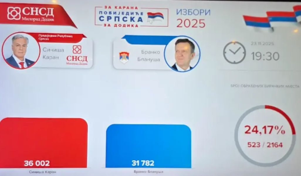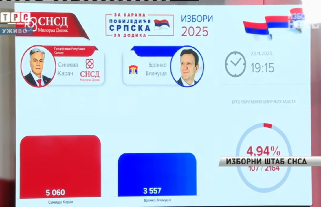 21.13 Razlika između kandidata SNSD-a Siniše Karana i SDS-ovog Branka Blanuše sada se ozbiljno smanjila. Karan je, prema SNSD-ovom podacima, imao prednost od 9000 glasova, a sada je ta prednost svega 3.500 glasova, prenosi Istraga.
