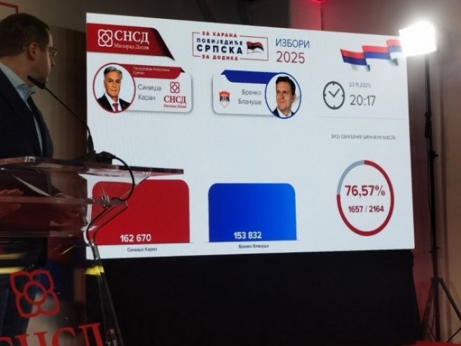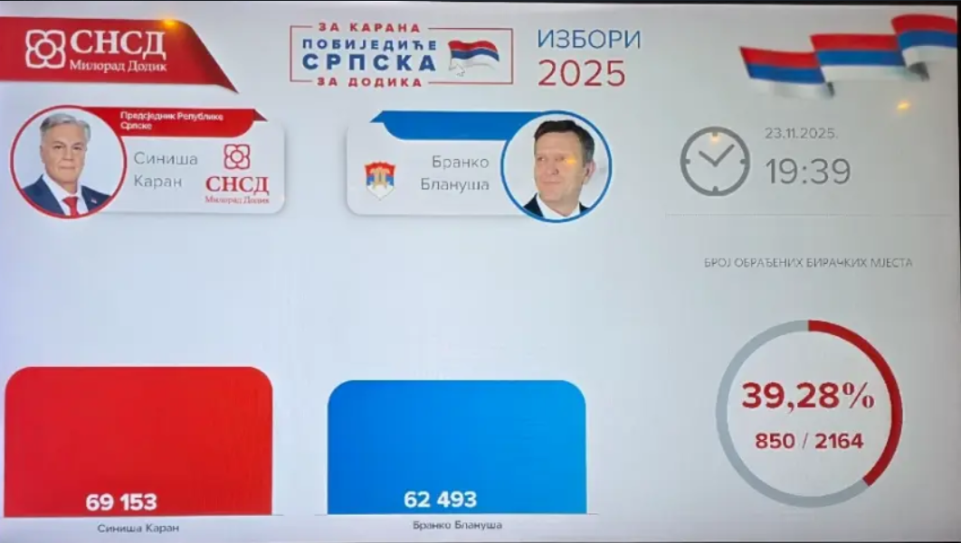 19.53 - SNSD je objavio je da na osnovu 47 posto obrađenih glasova njihov kandidat Siniša Karan osvojio 89.859 glasova. Branko Blanuša je osvojio 80.874 glasa.