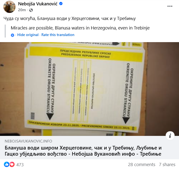 20.03 - "Čuda su moguća, vodi Blanuša u Hercegovini, čak i u Trebinju", napisao je Nebojša Vukanović.