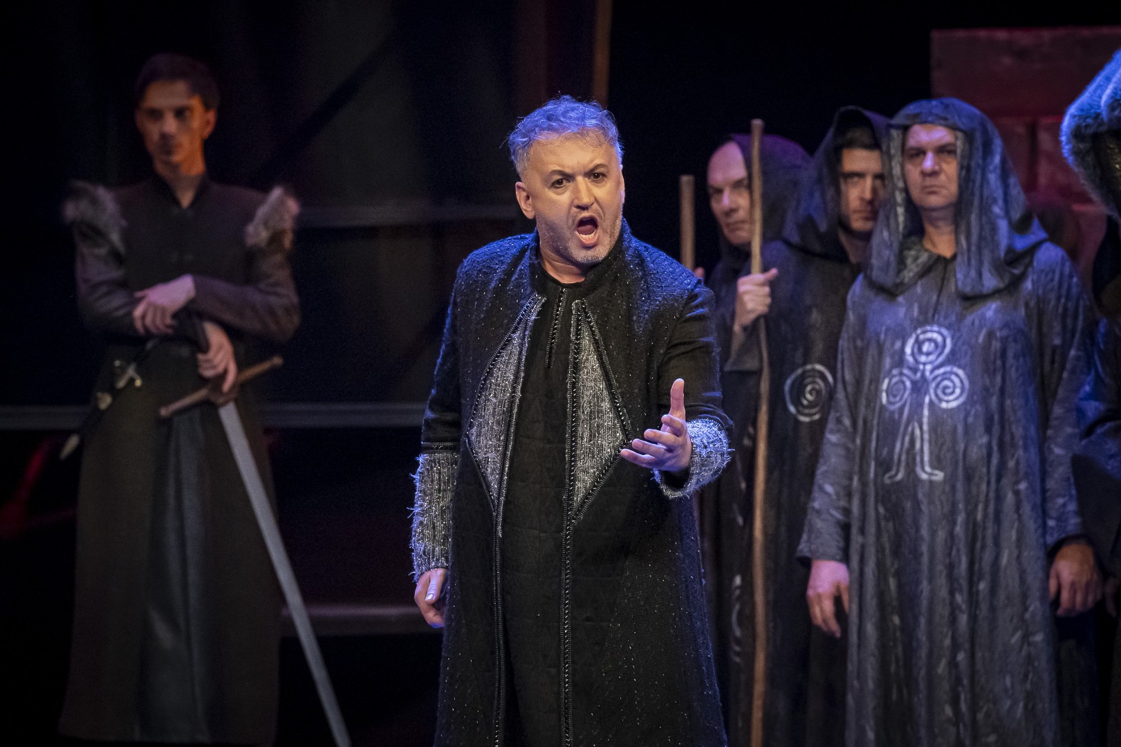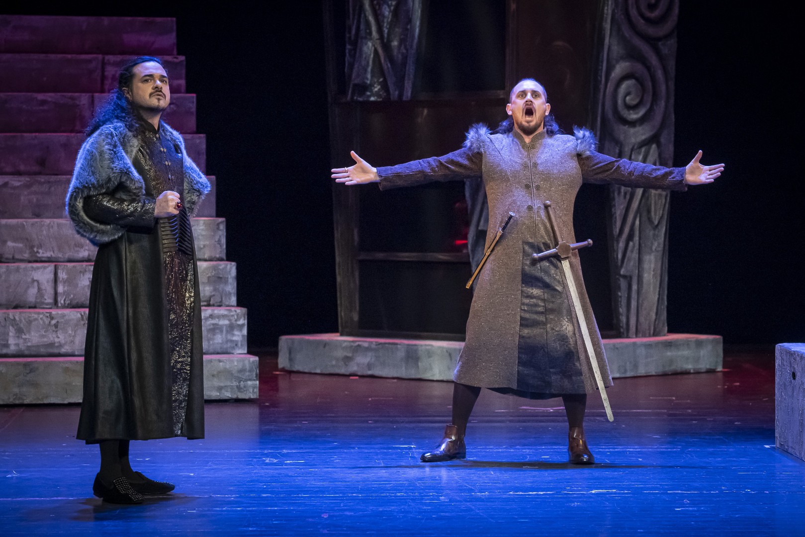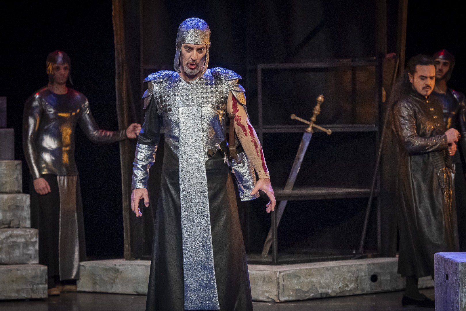 Naslovnu ulogu Tvrtka iznijet će solista Opere NPS Ivan Šarić; Grubaču, Tvrtkovu nevjenčanu suprugu igra Jana Cvetković/Adelisa Saračević; u ulozi kneginje Jelene, Tvrtkove majku slušat ćemo Katarinu Kikić Marić; dok će Doroteju, kraljicu bosansku utjeloviti Hana Salihović. Amir Saračević igra ulogu Vuka Tvrtkovog brata; dok će Ileš Bečei utjeloviti lik Vuka Dabišića, plemića, zavjerenika protiv Tvrtka. Solista Opere Erol Ramadanović igra lik Hotjana, Tvrtkovog savjetnika. Did bosanski, poglavar Crkve bosanske je Ivica Šarić; Vlatko Hranić, bosanski vitez i velikaš Denis Isaković.