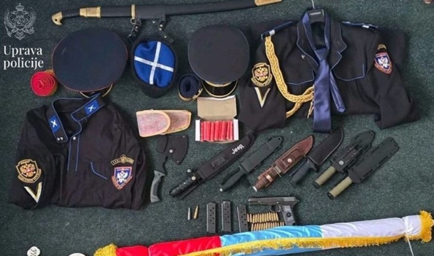 Među oduzetim predmetima pronađene su i brojne vojne uniforme, panciri, kacige, SIM kartice, komunikacijski uređaji, kao i iskaznice Crnogorskog kozačkog bratstva, često s različitim imenima.