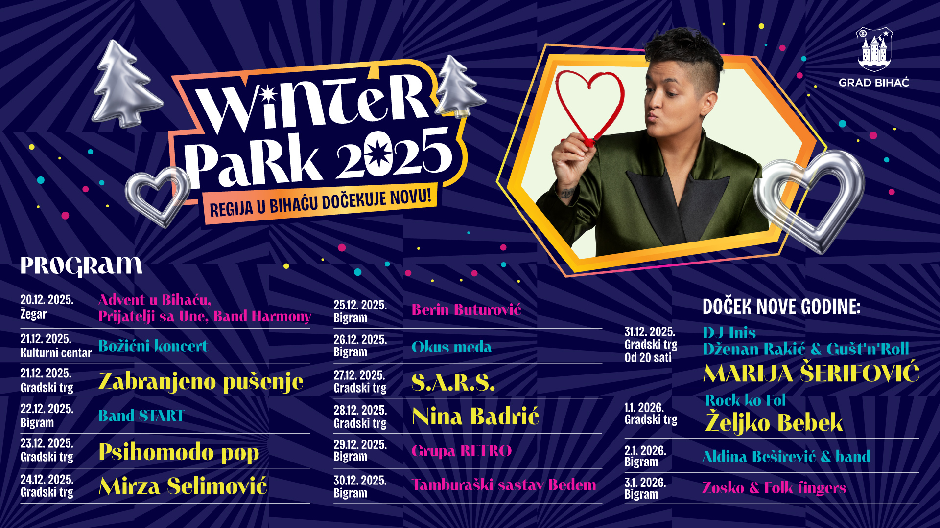 Grad Bihać je okončaopripripreme za ovogodišnji Winter park koji će trajati od 20. decembra ove do 3. januara naredne godine. Kako je najavljeno, tokom 15 dana trajanja zimske priče u gradu na Uni, na dvjema pozornicama će se smjenjivati najveća regionalna muzička imena, a vrhunac se očekuje na novogodišnjem koncertu Marije Šerifović koji važi za jedan od najočekivanijih događaja ove zime.
