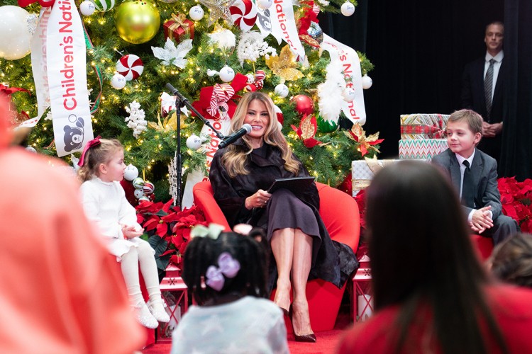 Prva dama je sjedila u velikoj crvenoj stolici ispred visoke novogodišnje jelke i čitala priču Mac Barnetta "Kako se Djeda Mraz spušta niz dimnjak?" grupi od dvadesetak malih pacijenata i ostalim okupljenima.