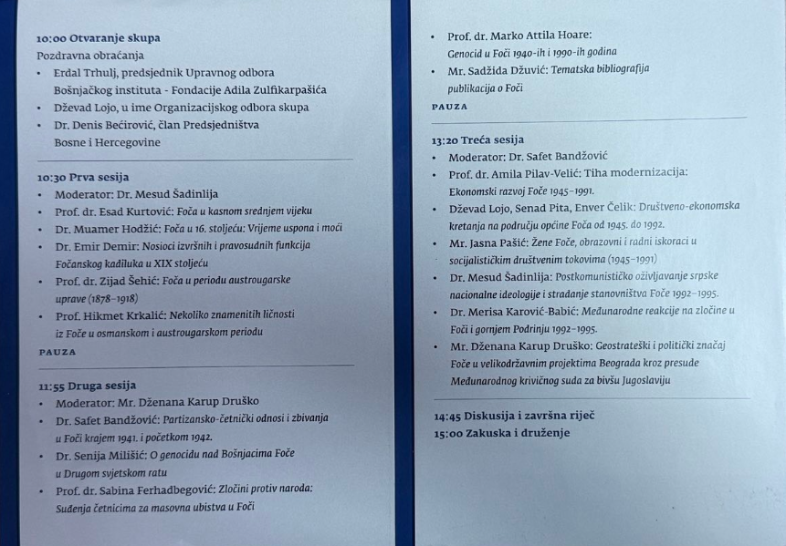 Skup će okupiti istaknute istraživače i univerzitetske profesore koji će u tri sesije govoriti o različitim historijskim periodima Foče – od srednjeg vijeka i osmanskog doba, preko zbivanja u Drugom svjetskom ratu, do savremene historije i dešavanja tokom agresije na BiH 1990-ih godina.