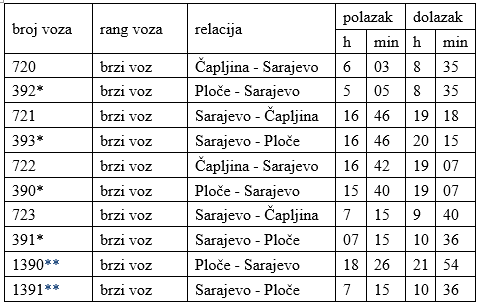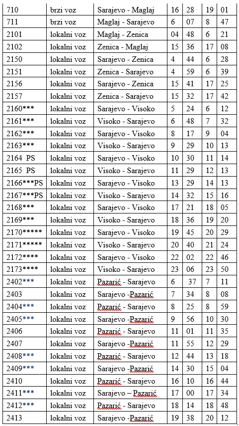 Vozovi će saobraćati u terminima navedenim u tabeli, uz prateće napomene.