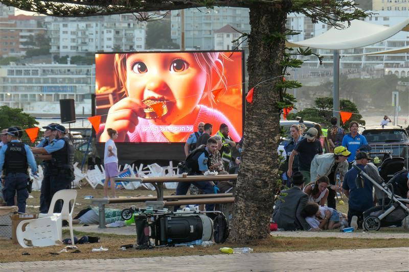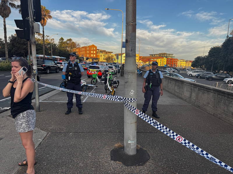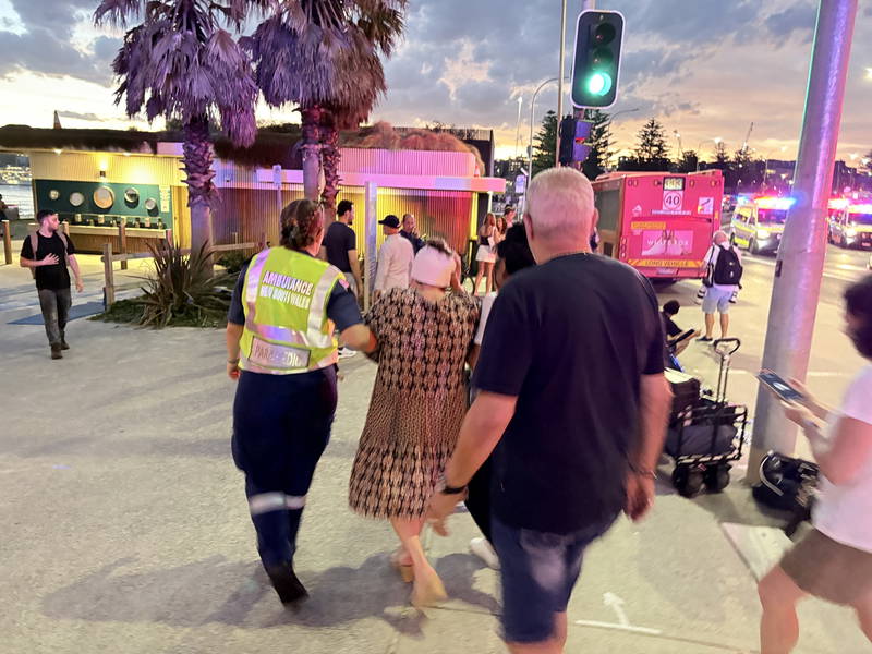 Sunce je zašlo nad Bondijem, a područje je i dalje preplavljeno policijskim vozilima, dok policijski helikopter kruži iznad naselja.