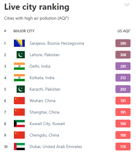 Zrak u Sarajevu jutros je opasan sa indeksom kvalitete od 324. IQ Air je objavio listu najzagađenijih gradova svijeta, na kojoj je Sarajevo i jutros na prvom mjestu, ispred Lahorea, New Delhija, Kolkate, Karachija...