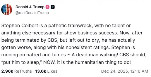 Predsjednik SAD Donald Trump zatražio je u četvrtak da se voditelj Stephen Colbert odmah ukloni s televizije, nazivajući ga "mrtvacem koji hoda".