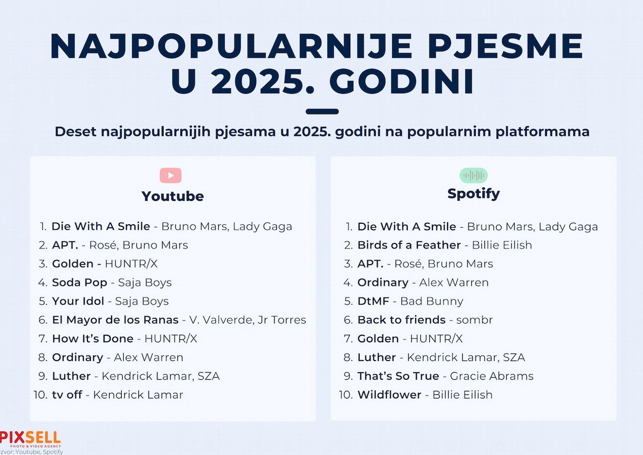 YouTube tabela uključuje i dva naslova grupe Saja Boys, kao i više pjesama izvođača Kendricka Lamara, dok Spotify lista donosi raznolik raspon izvođača – od Bad Bunnyja i SZA do Gracie Abrams i ponovnog pojavljivanja Billie Eilish s još jednim naslovom među deset najslušanijih.