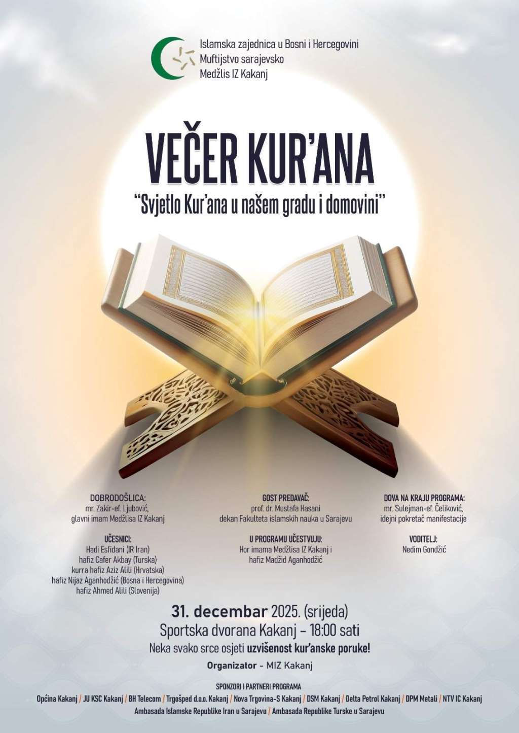U organizaciji Medžlisa Islamske zajednice Kakanj, večeras će biti održana 26. tradicionalna manifestacija "Večer Kur’ana" pod nazivom "Svjetlo Kur’ana u našem gradu i domovini".