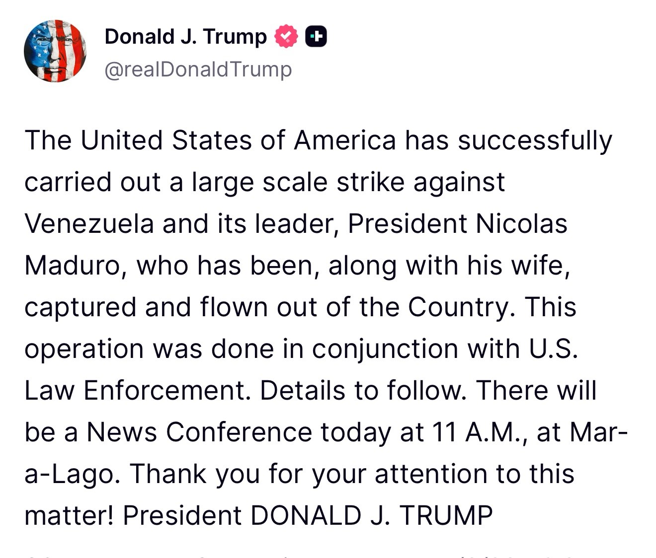 Predsjednik Sjedinjenih Američkih Država Donald Trump izjavio je da su SAD izvele "napade velikih razmjera na Venecuelu" te da su "zarobili njenog lidera, predsjednika Nicolása Madura", kao i njegovu suprugu.