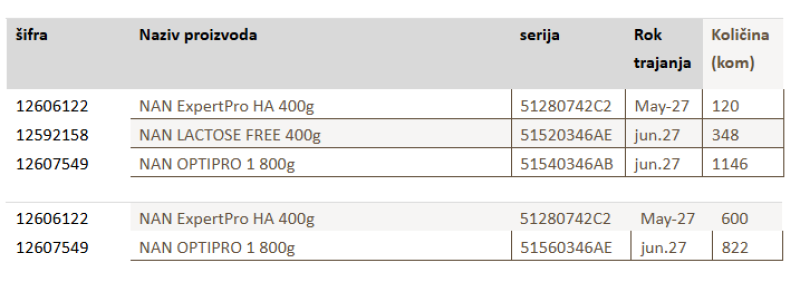 Agencija za sigurnost hrane Bosne i Hercegovine, do trenutka objave ove informacije, od strane uvoznika, mjerodavnih inspekcijskih tijela, kao ni posredstvom Sistema brzog uzbunjivanja za hranu i hranu za životinje (EU RASFF) nije službenim zaprimila obavijest o opozivu navedenih proizvoda, kaže se u saopćenju.