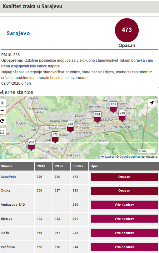 Tokom dana u dijelovima teritorije Bosne i Hercegovine zabilježen je porast zagađujućih materija u zraku te je došlo do drastičnog pogoršanja kvaliteta zraka. Najzagađeniji grad je Sarajevo u kojem, prema podacima od 15.00 sati, indeks kvaliteta zraka iznosi 473 i opasan je za stanovništvo.