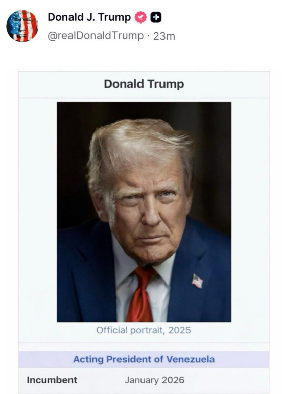 Američki predsjednik Donald Trump objavio je na svojoj društvenoj mreži Truth Social screenshot na kojem stoji da je 45. i 47. predsjednik Sjedinjenih Država, ali i vršilac dužnosti predsjednika Venecuele od januara 2026. godine.