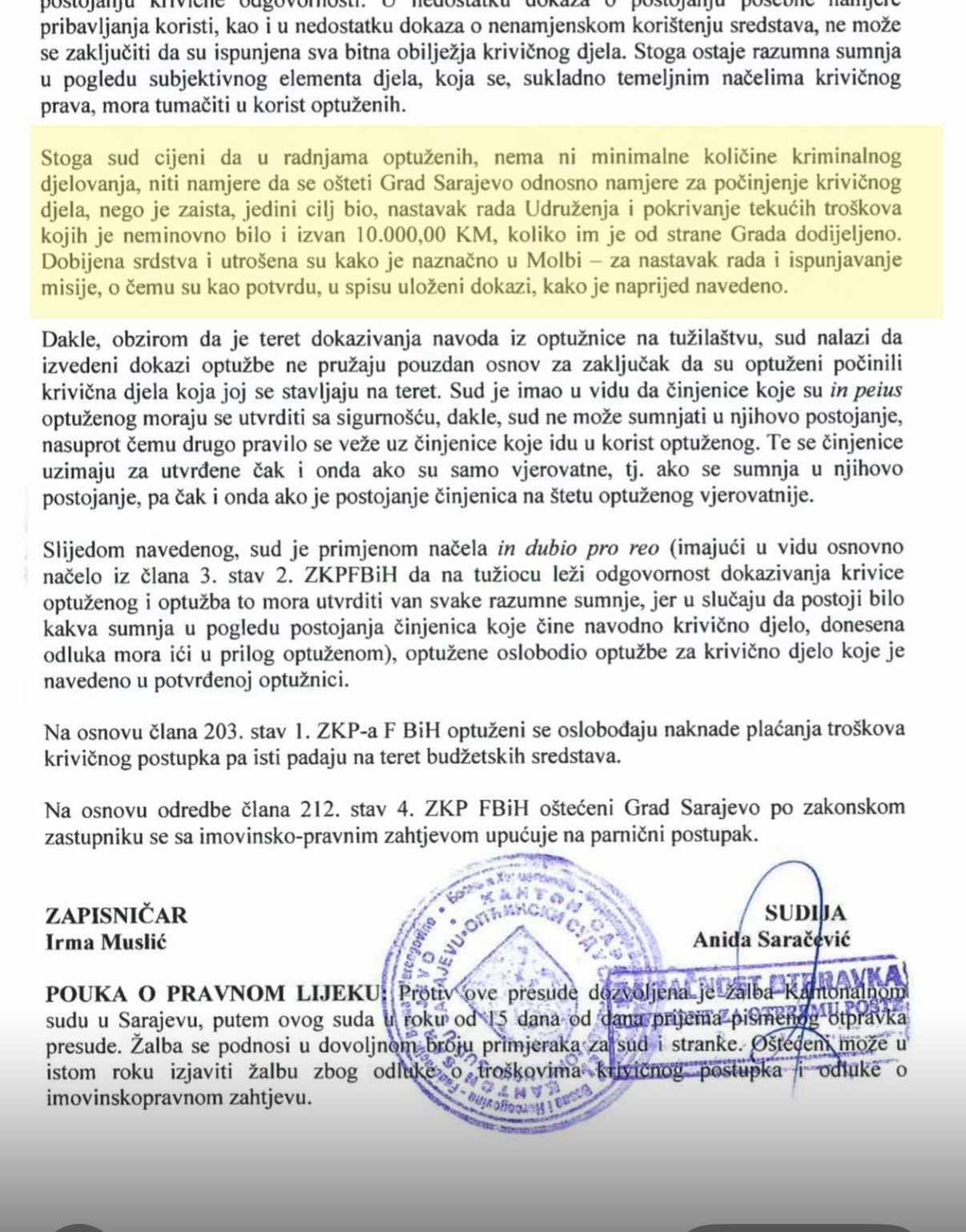 U oslobađajućoj presudi Sud navodi da “u radnjama optuženih nema ni minimalne količine kriminalnog djelovanja, niti namjere da se ošteti Grad Sarajevo, niti namjere za počinjenje krivičnog djela.“