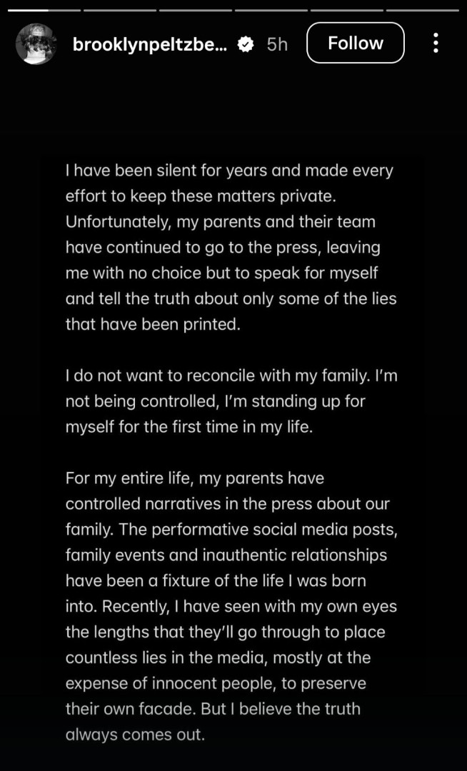„Ne želim se pomiriti sa svojom porodicom“, izjavio je Brooklyn Peltz Beckham u saopštenju na Instagramu u kojem se osvrnuo na svoj zategnuti odnos s roditeljima.
