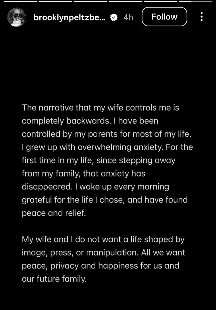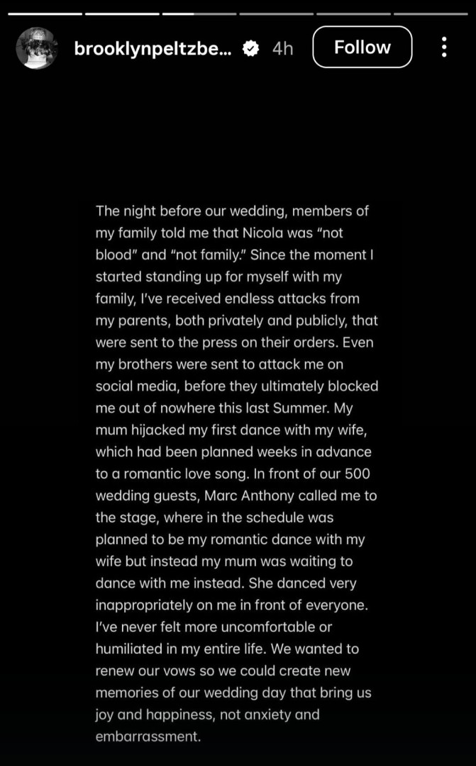Peltz Beckham, najstarije dijete Davida Beckhama i Victorie Beckham, optužio je svoje roditelje da „neprestano pokušavaju uništiti“ njegovu vezu s Nicolom Peltz Beckham, i prije i poslije njihovog vjenčanja 2022. godine.