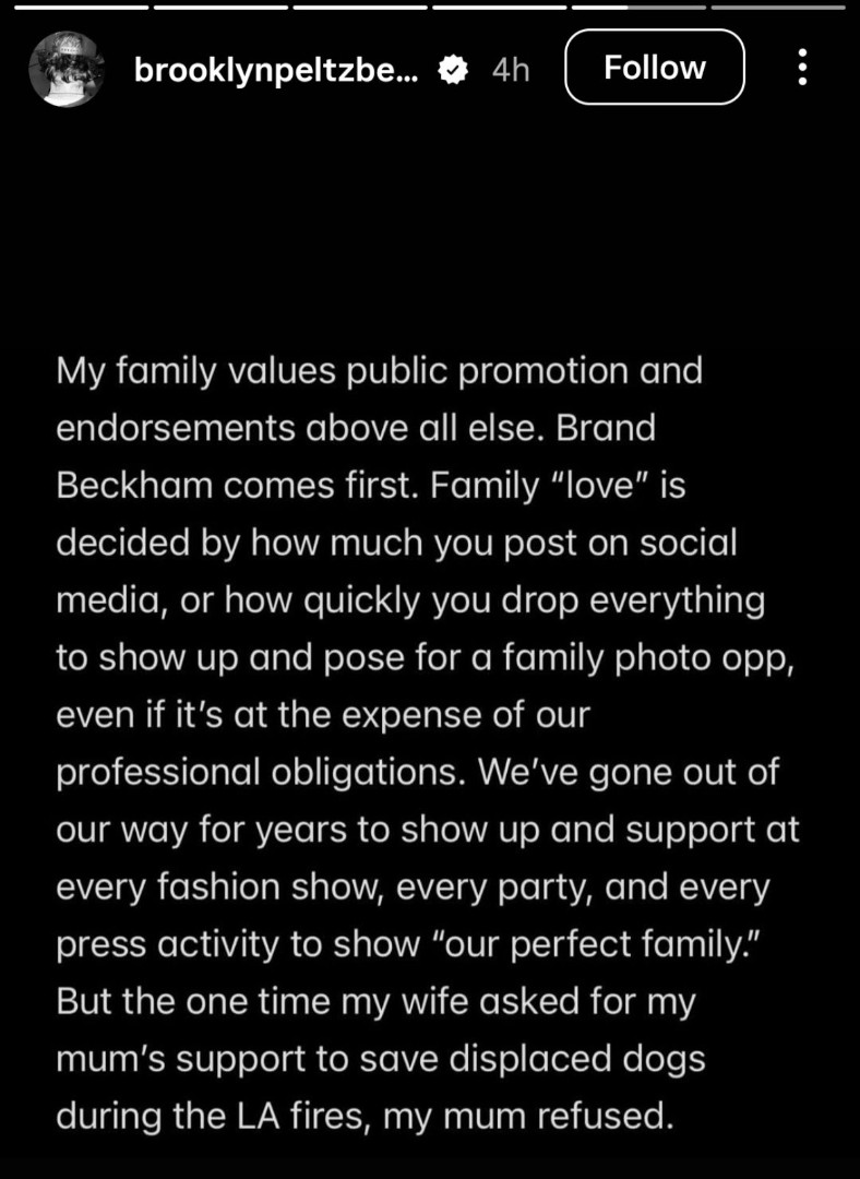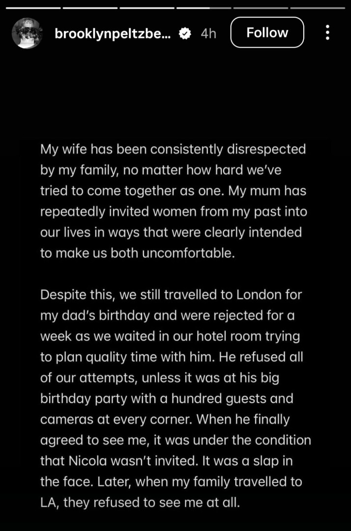 U svojoj objavi Peltz Beckham je rekao da su on i supruga otputovali u London na rođendan Davida, ali da su bili „odbijeni cijelu sedmicu dok su čekali u hotelskoj sobi pokušavajući isplanirati zajedničko vrijeme s njim“.