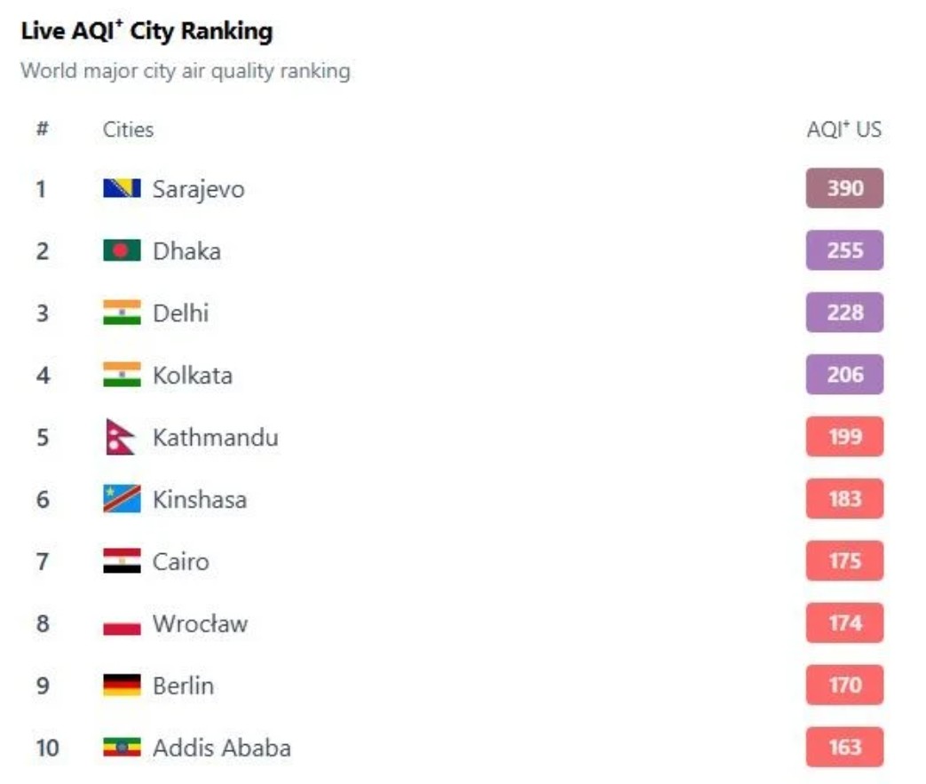 Sarajevo se jutros ponovo našlo na samom vrhu svjetske liste gradova s najzagađenijim zrakom, prema dostupnim podacima o kvalitetu zraka.