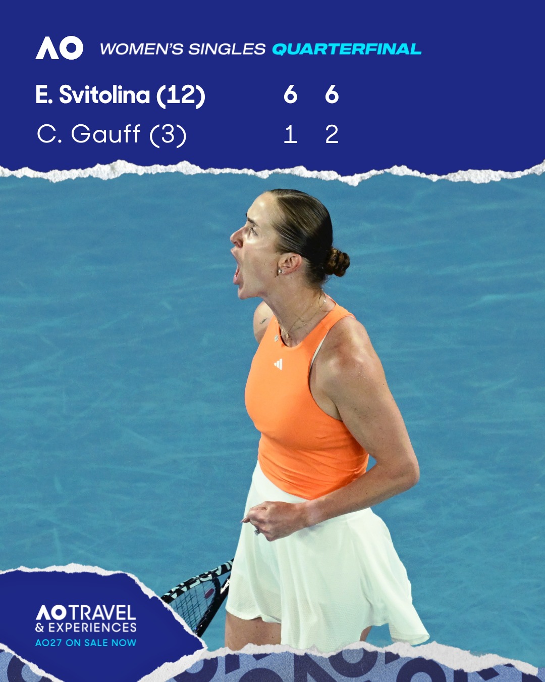 Dok se Gauff mučila sa servisom, velikim brojem neiznuđenih grešaka i, u početku, čak i napetošću žica na reketu, Svitolina je odigrala gotovo savršen meč i slavila sa 6:1, 6:2, ostvarivši tako plasman u svoje četvrto Grand Slam polufinale, prvo u Australiji, u dobi od 31 godine.