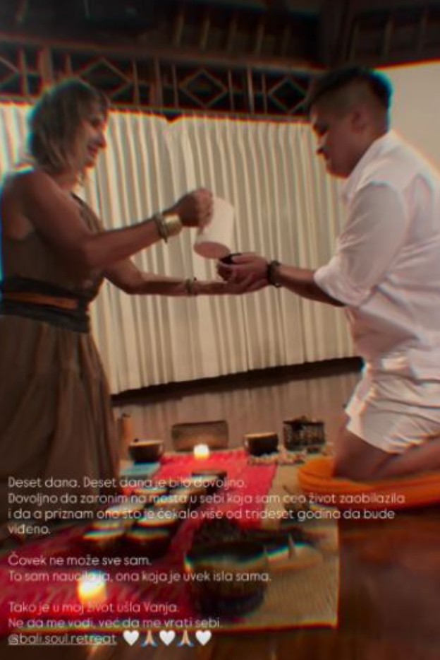 "Deset dana. Bilo je dovoljno da zaronim u one dijelove sebe koje sam cijeli život zaobilazila i da priznam ono što je čekalo više od trideset godina da bude viđeno. Čovjek ne može sve sam. To sam naučila ja, ona koja je uvijek išla sama. Tako je u moj život ušla Vanja. Ne da me vodi, nego da me vrati sebi“, napisala je Šerifović.