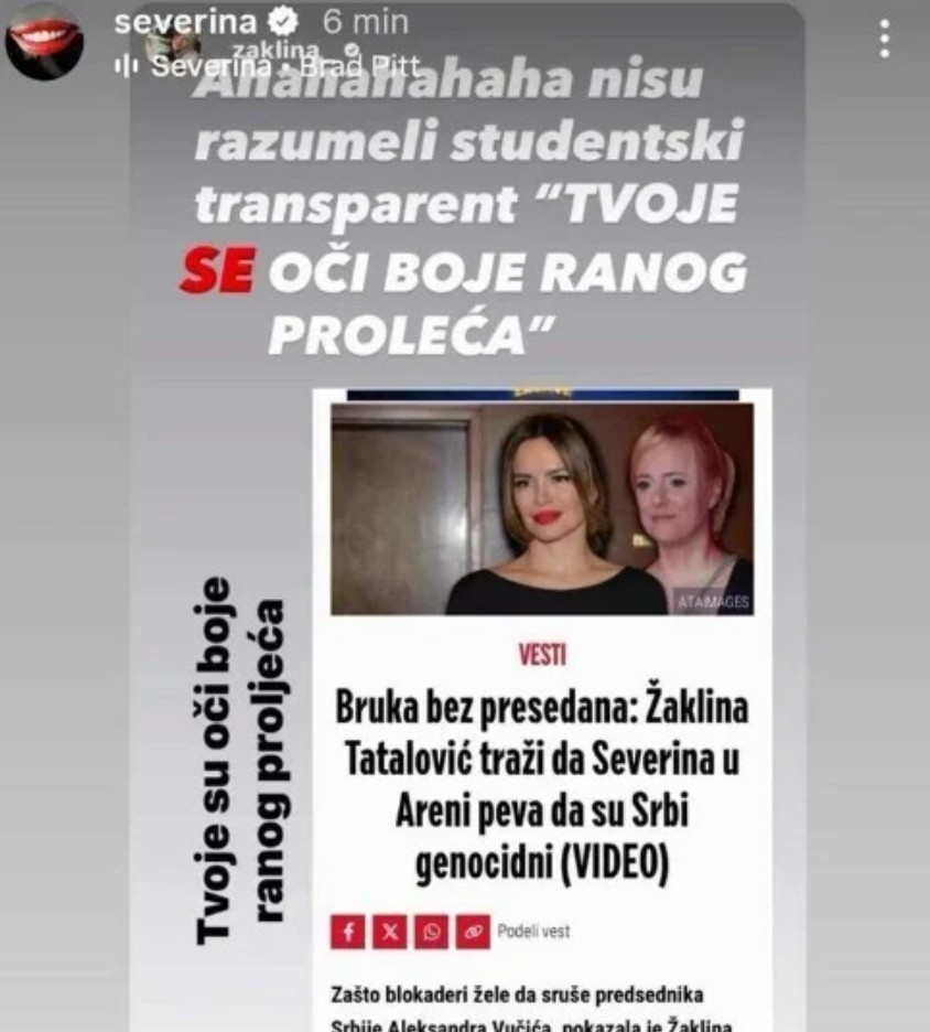 Severina je na to dodala: "Laž ponovljena u Vučićevim medijima milion puta i dalje je laž, kao i sve što on kaže. Nikad nisam rekla da su Srbi genocidni, Vučić je genocidan, a ne voli niti Srbe! A i Vučić se rimuje sa k****ć. Severina Vučković".