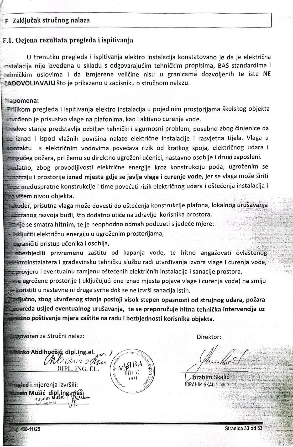 U zapisniku o stručnom nalazu navedeno je da se stanje smatra hitnim, da je neophodno odmah poduzeti sljedeće mjere: isključiti električnu energiju u ugroženim prostorijama, ograničiti pristup učenika i osoblja, obezbjediti privremenu zaštitu od kapanja vode, HITNO angažovati ovlaštenog elektroinstalatera i građevinsku tehničku službu radi utvrđivanja izvora vlage i curenja vode, provjere i eventualne zamjene oštećenih električnih instalacija i sanacije prostora.