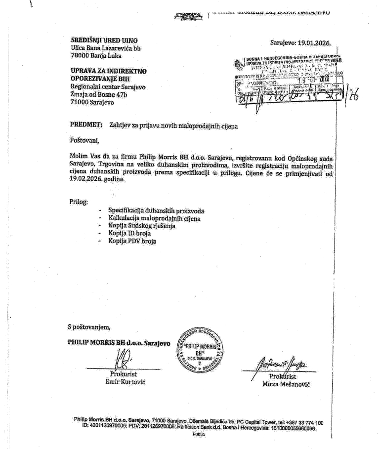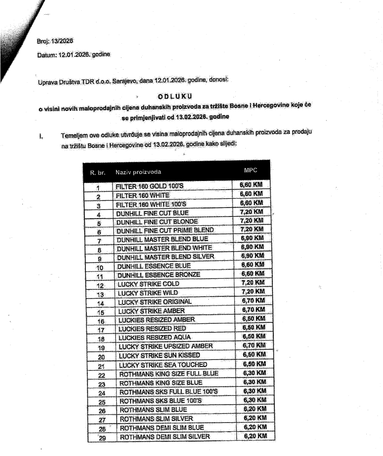 Od petka će se primjenjivati novi cjenovnik za cijene cigareta koje distribuira Tvornica duhana Rovinj (TDR), Philip Morris BH i Nelt. Ovime su potvrđene informacije koje je objavio portal Vijesti.ba.