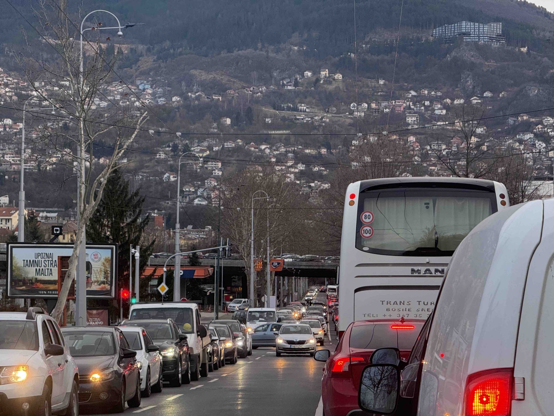 Posebno teška situacija je u Zagrebačkoj ulici u naselju Grbavica, gdje se vozila kreću otežano ili gotovo stoje.