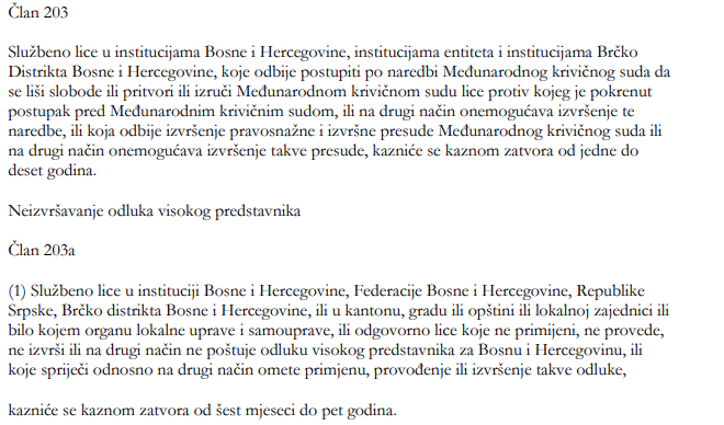 Povodom Zahtjeva Ustavnog suda BiH za ocjenu ustavnosti odredbe člana 203a. Krivičnog zakona BiH, kao i samostalnog člana 4. Zakona o izmjenama i dopunama Krivičnog zakona zakona BiH, Ustavnopravna komisija usvojila je zaključak kojim je konstatirala da visoki predstavnik u BiH nema ustavnu nadležnost da donosi zakone, zbog čega su navedene odredbe Zakona o izmjenama i dopunama Krivičnog zakona BiH neustavne.