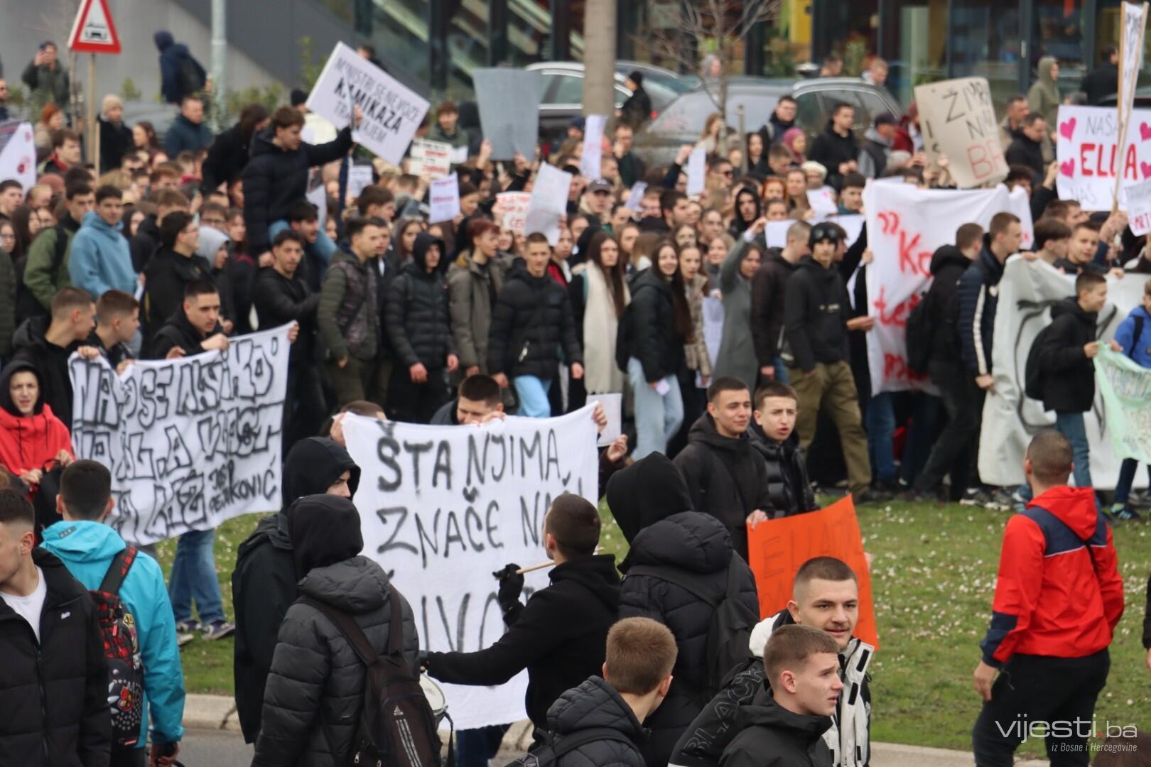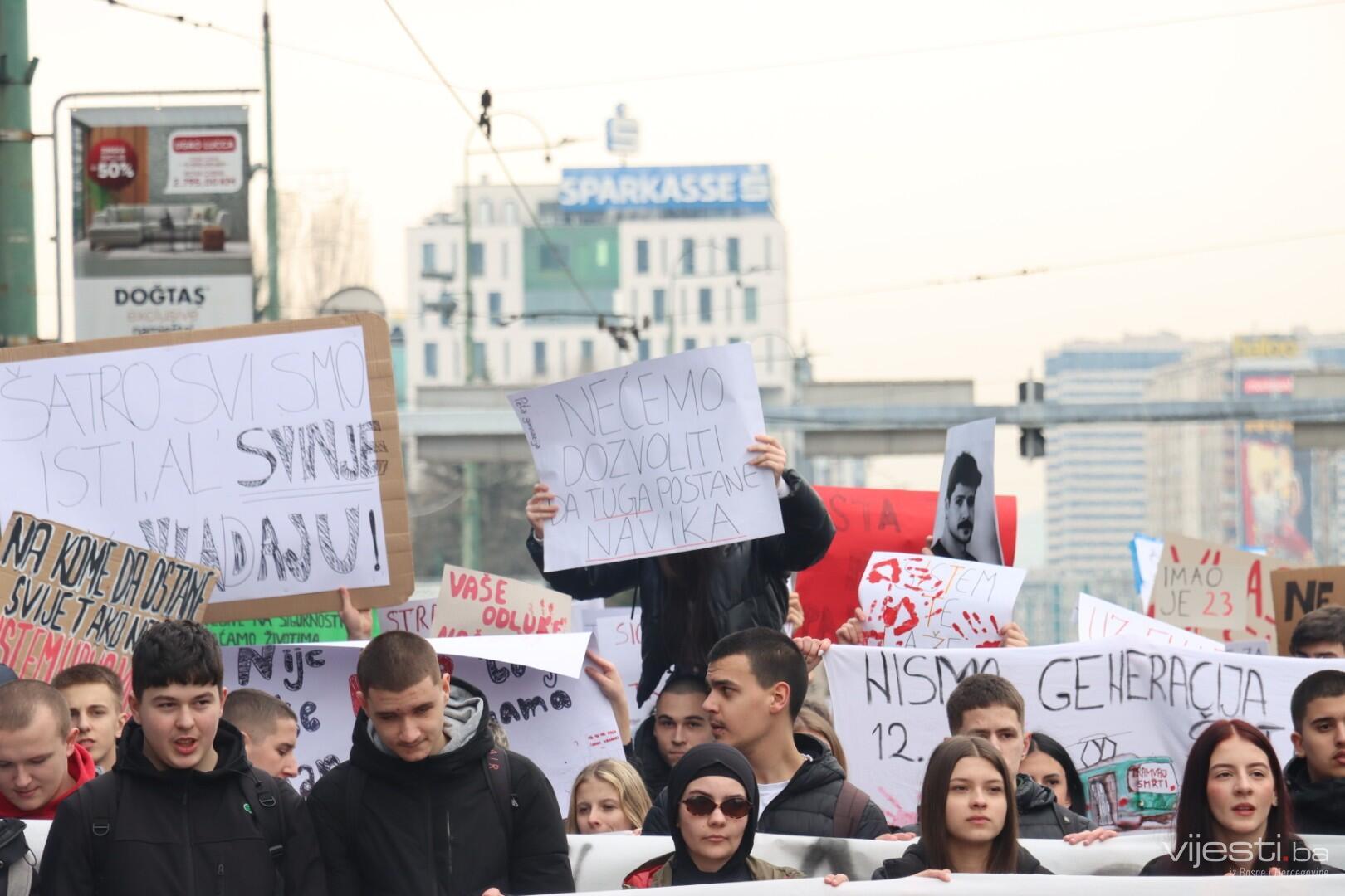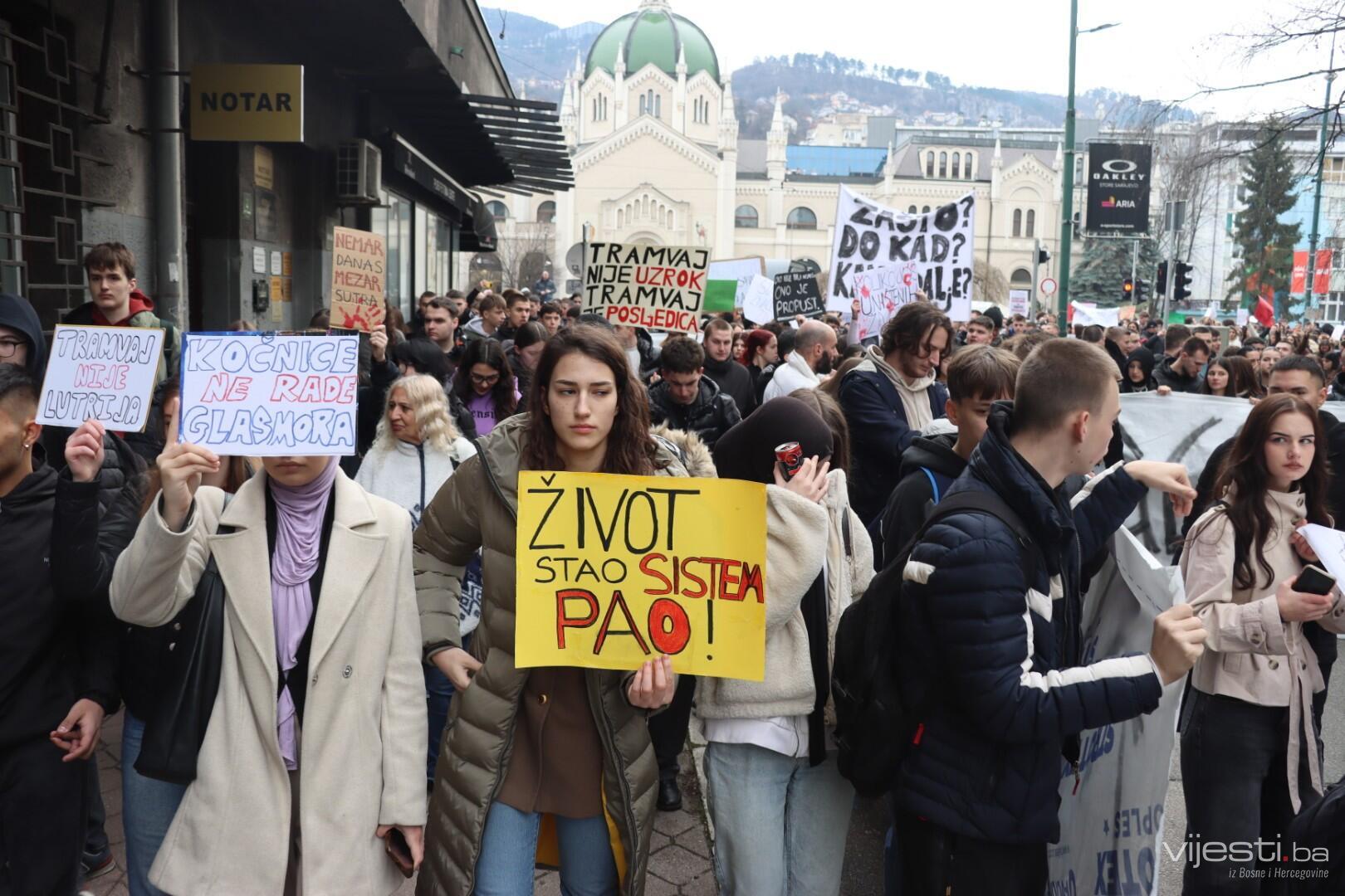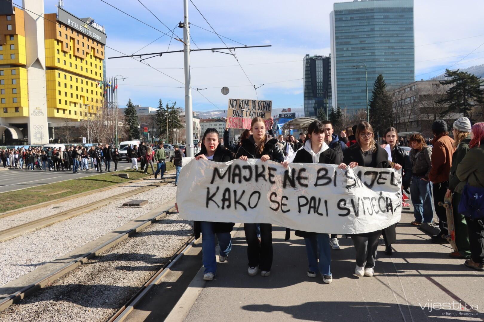 14:17 - Demonstranti sada idu preko Skenderije prema Općoj bolnici, gdje će izraziti podršku povrijeđenoj Elli, a zatim će, za razliku od prethodnih dana, kako javlja N1, doći i ispred Suda Bosne i Hercegovine. Današnja ruta nešto je drukčija od ranijih.