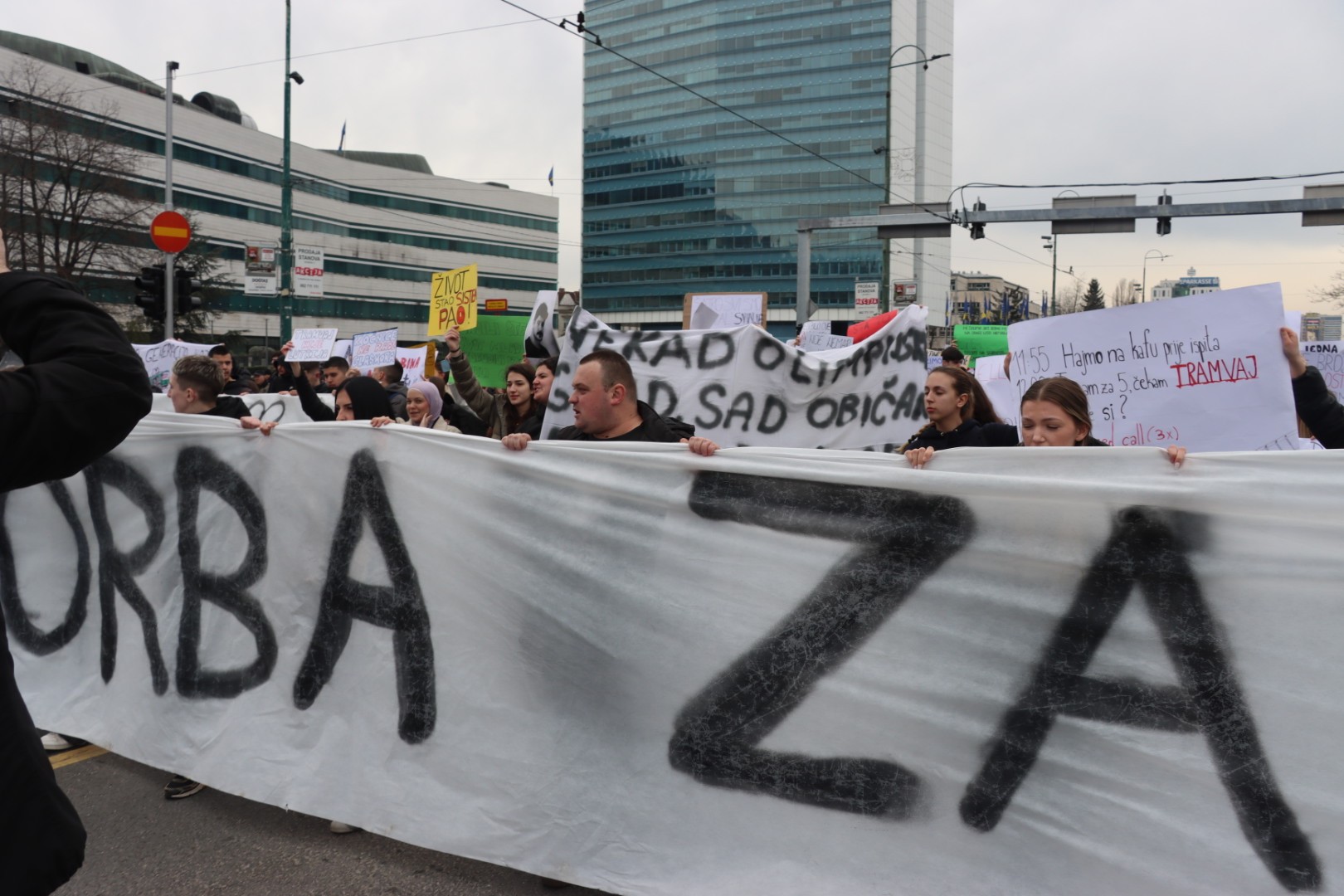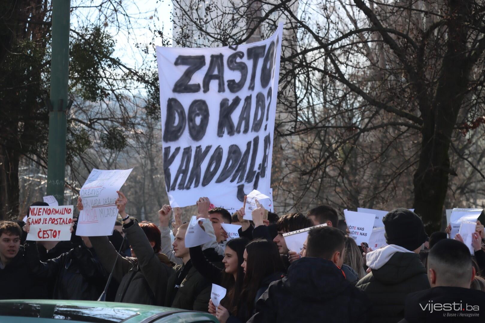 12:11 - Sve je blokirano kod Zemaljskog muzeja. Četvrti skup u Sarajevu, po svemu sudeći, bit će i najmasovniji. Okupljeni nove brojne transparente, a najveći među njima je onaj “Ovo smo mogli biti mi”.