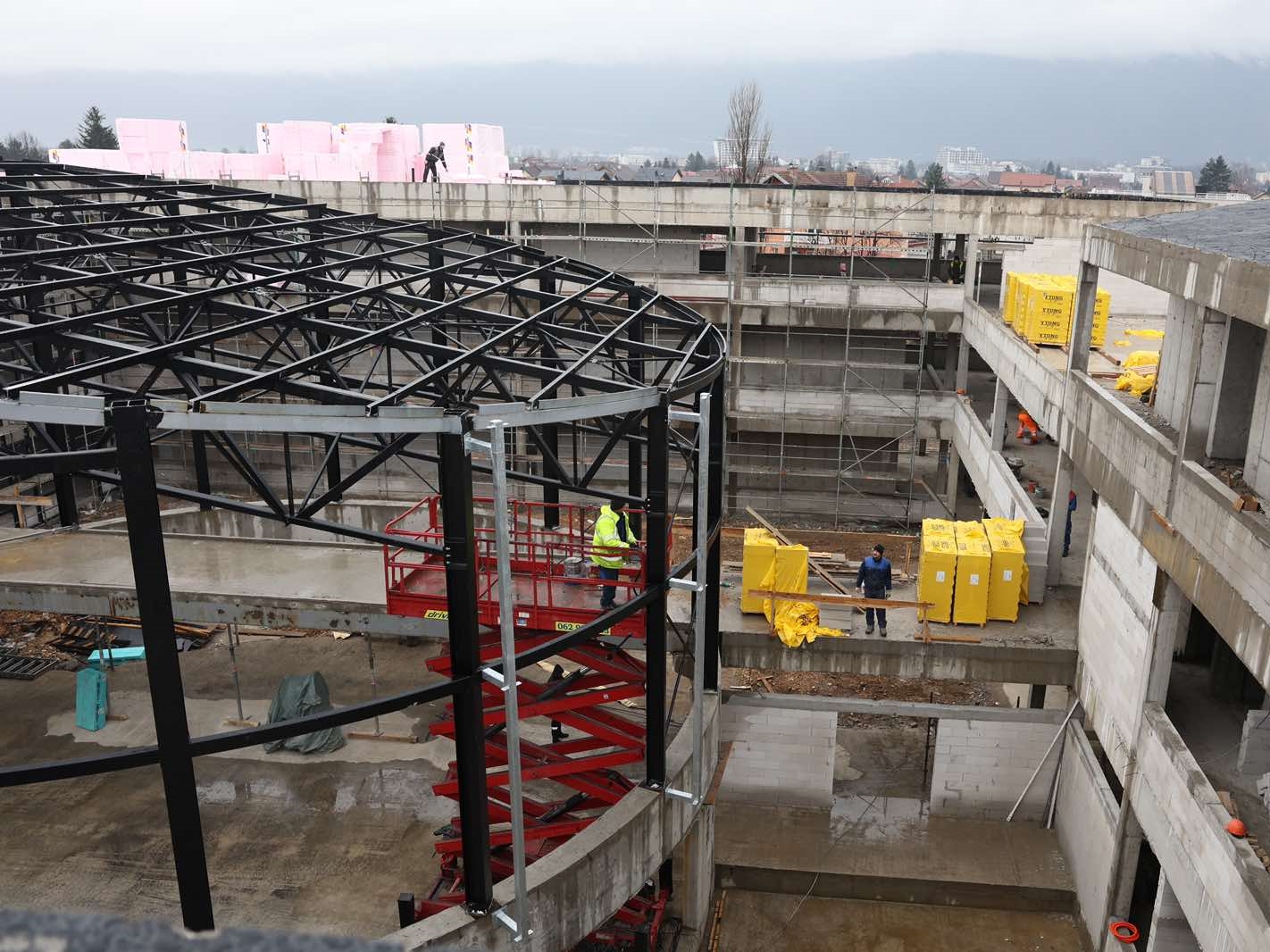 U toku je montaža čelične konstrukcije sportske dvorane, čime objekat dobija svoje jasne arhitektonske obrise. Istovremeno se unutar objekta izvode intenzivni zidarski radovi, kao i postavljanje podova, pregrada i plafona. Ugrađuje se i savremena aluminijska fasada koja će, pored estetske vrijednosti, osigurati visoke standarde energetske efikasnosti i dugotrajnosti objekta.