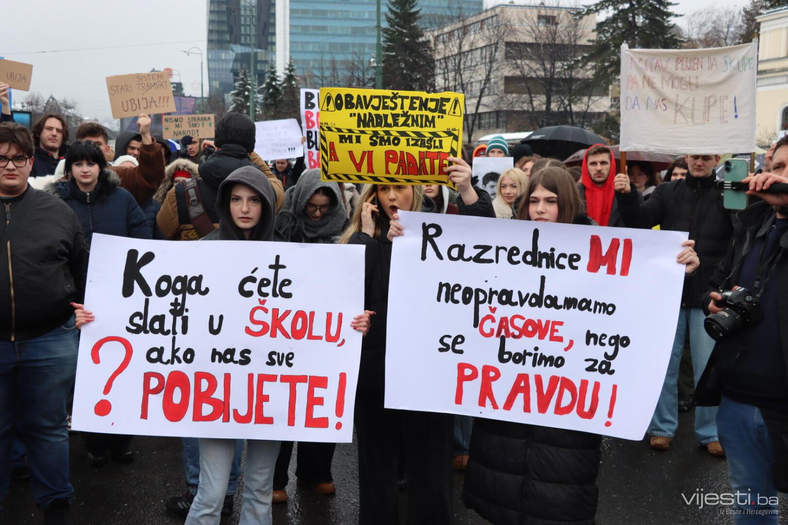 13.25 - Mladi nose transparente sa snažnim porukama upućenim nadležnima. "Koga ćete slati u školu, ako nas pobijete", "Zar je potrebno da nas tramvaji ubiju, da bi Vlada nešto poduzela"...