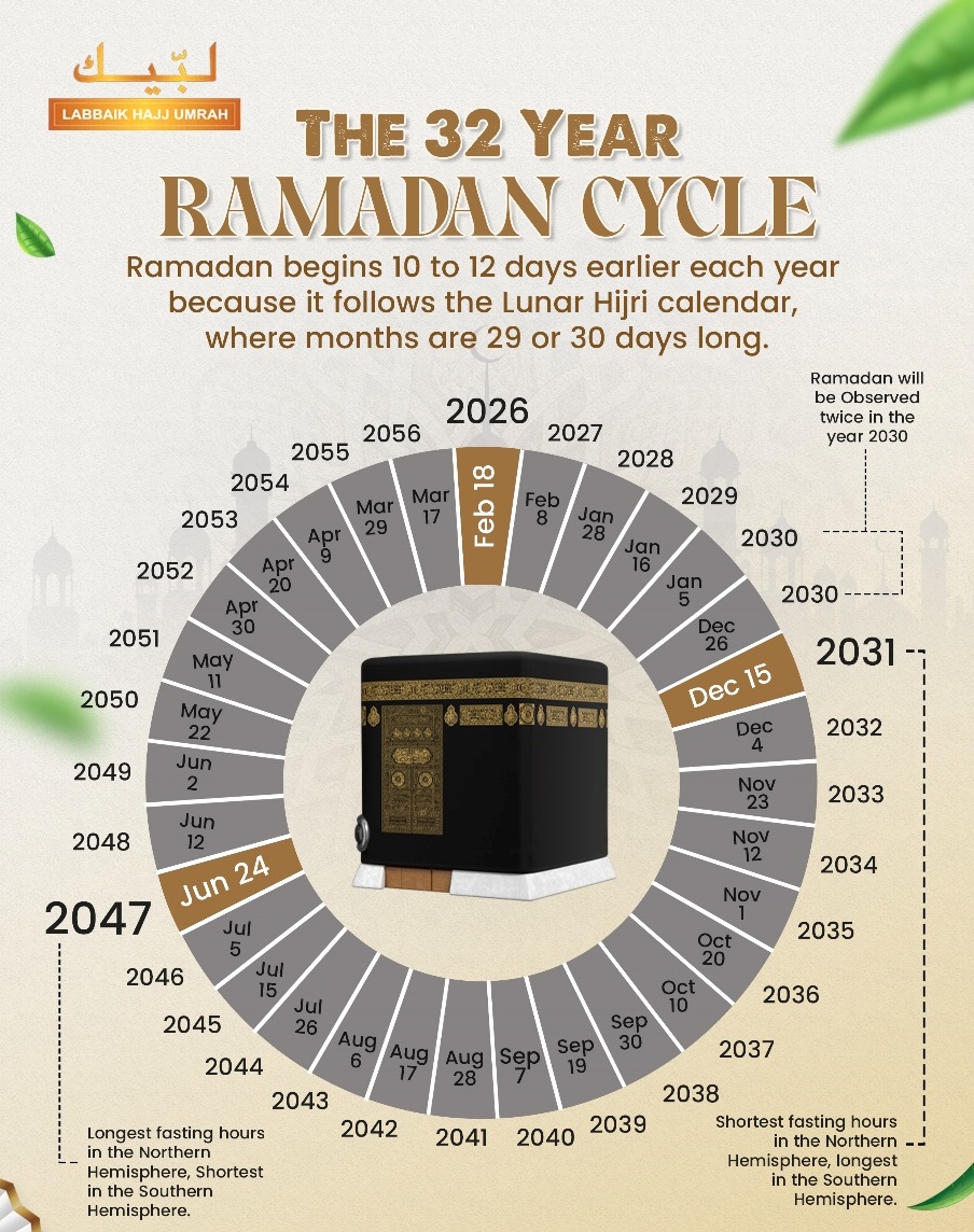 Following a 33-year lunar cycle, Ramadan shifts 10–12 days earlier annually — observed twice in 2030, with extremes in 2031 and… pic.twitter.com/GUPSlh6553